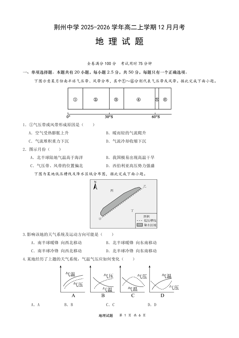高二地理--湖北省荆州市荆州中学2025-2026学年高二上学期12月月考