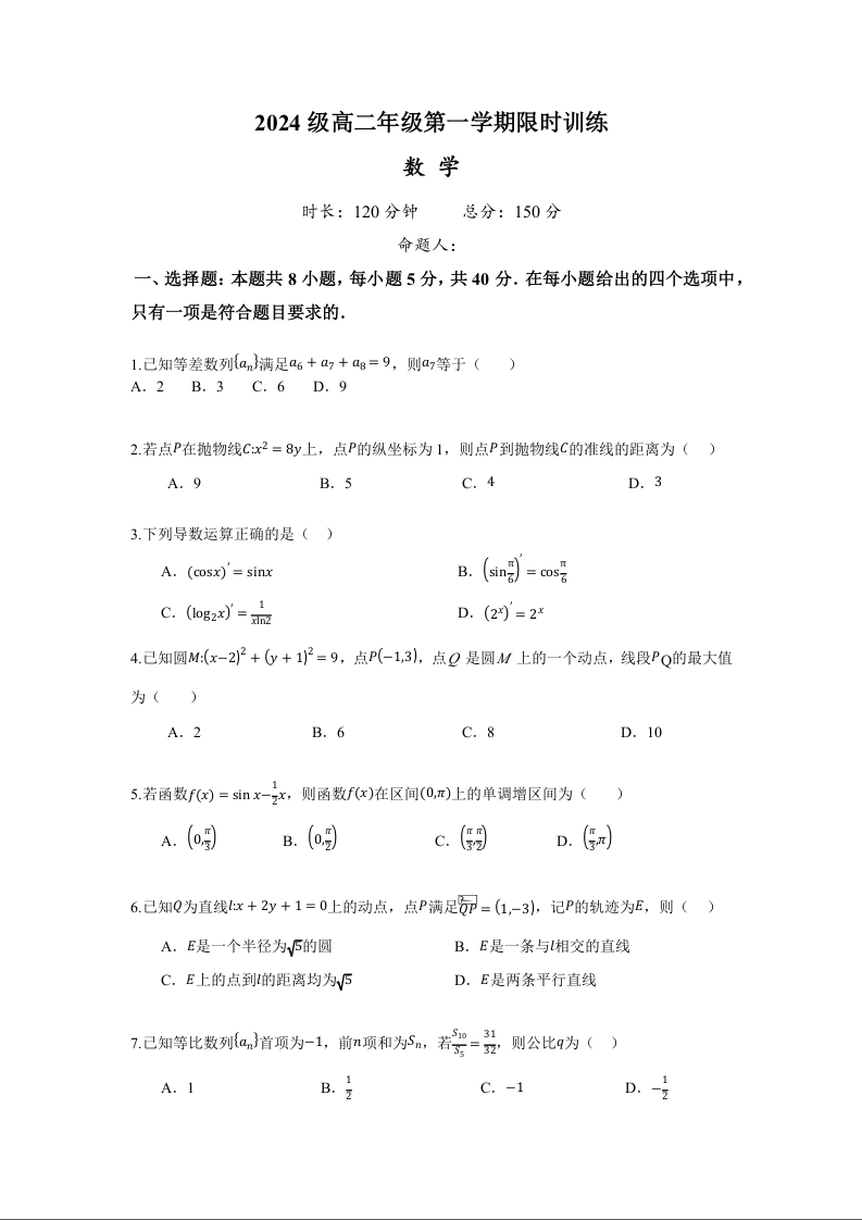 高二数学(原卷版)--湖南省长沙市南雅、雅礼实验中学等五校联考2025-2026学年高二上学期12月限时训练