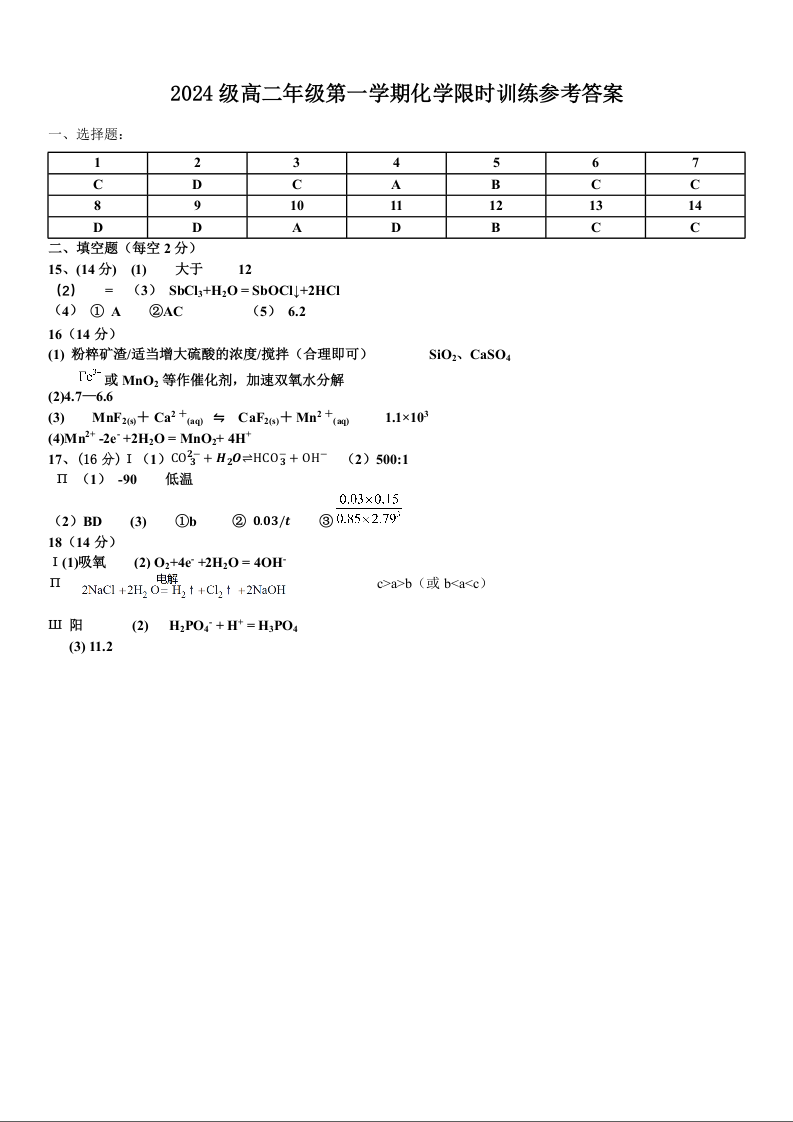 高二化学答案--湖南省长沙市南雅、雅礼实验中学等五校联考2025-2026学年高二上学期12月限时训练