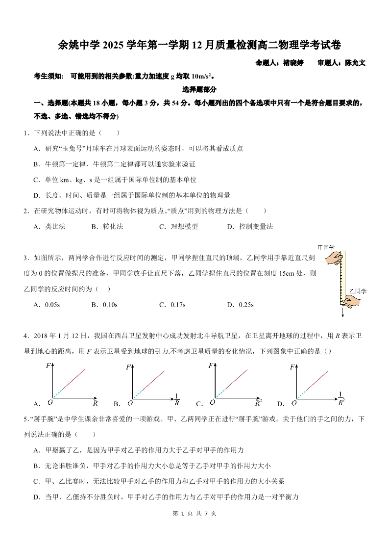 高二物理答案--浙江省余姚中学2025-2026学年高二上学期12月月考