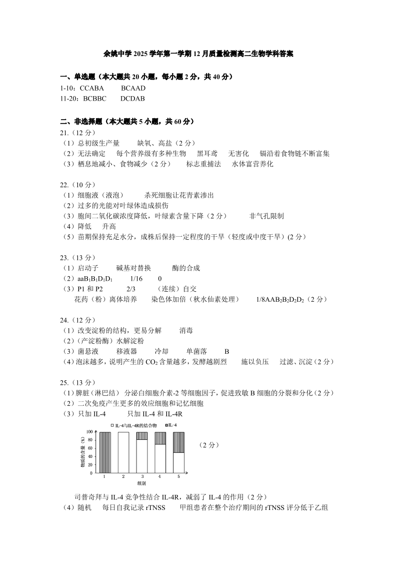 高二生物答案--浙江省余姚中学2025-2026学年高二上学期12月月考