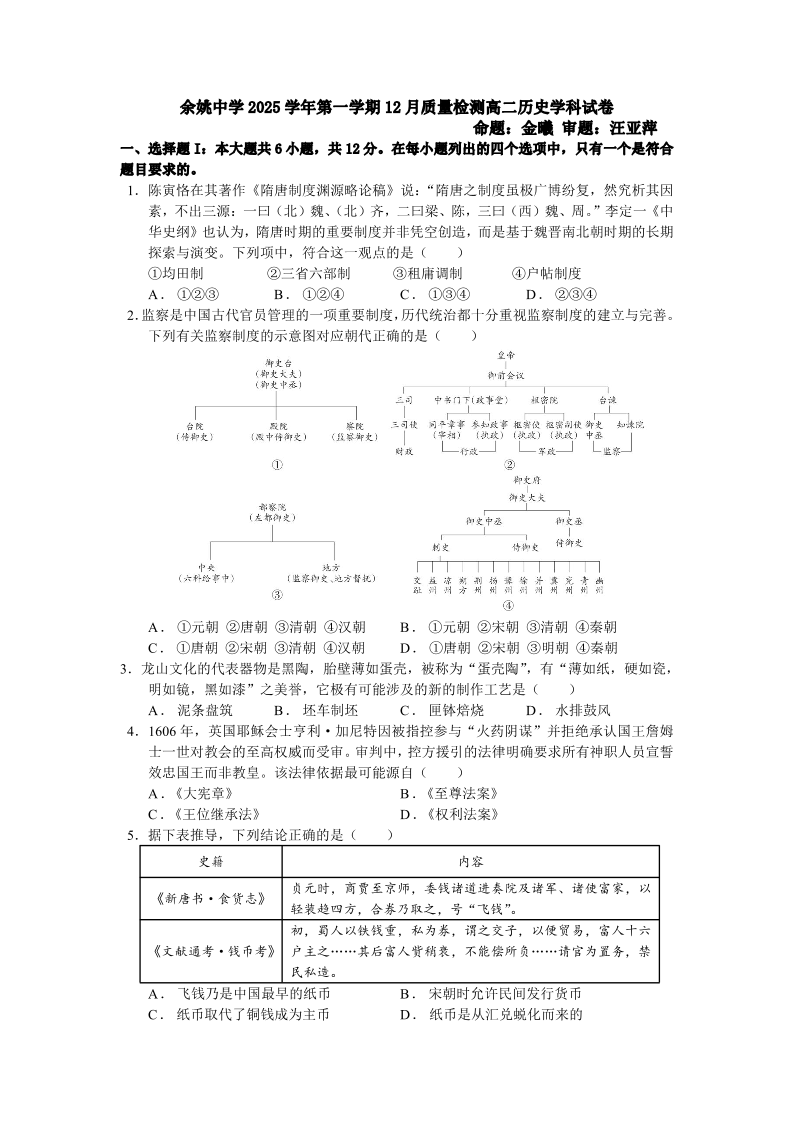 高二历史--浙江省余姚中学2025-2026学年高二上学期12月月考
