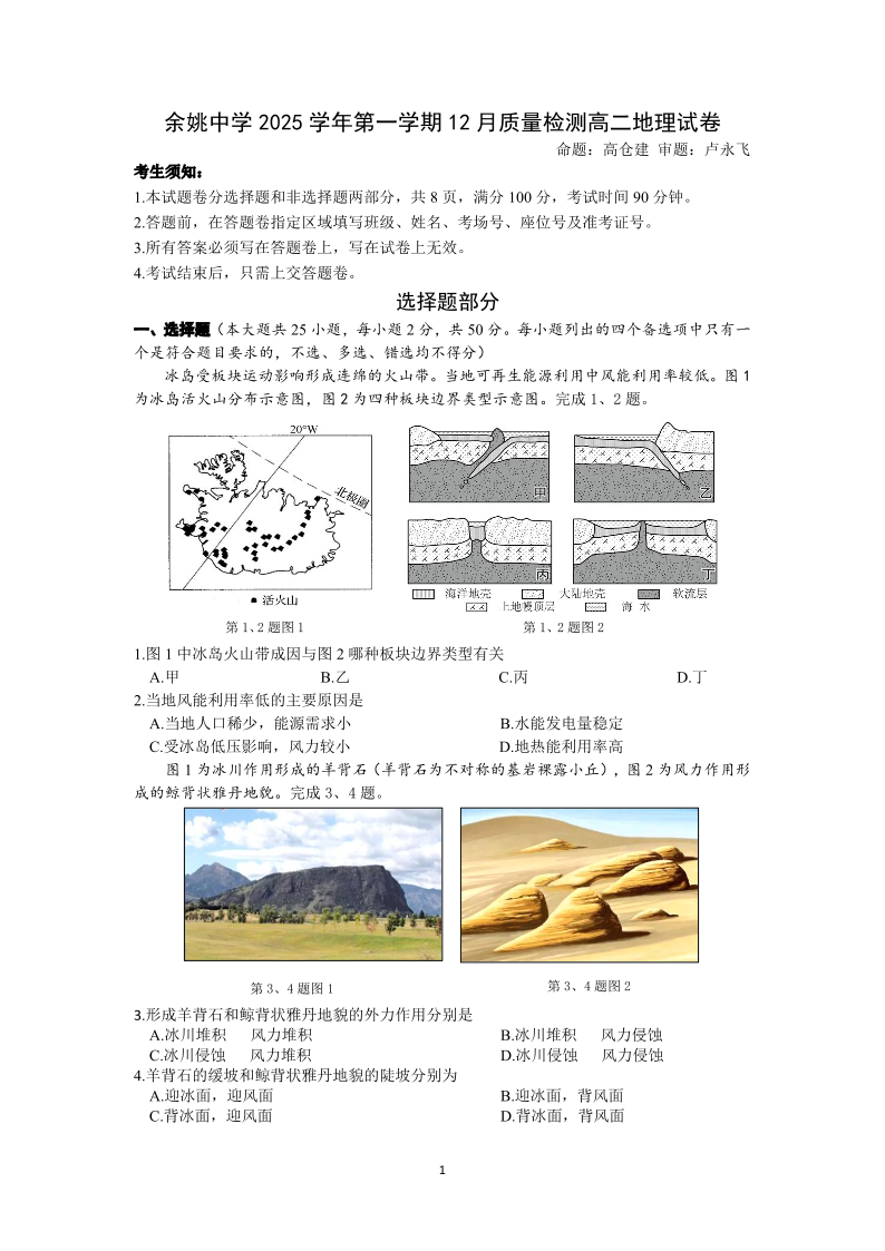 高二地理--浙江省余姚中学2025-2026学年高二上学期12月月考