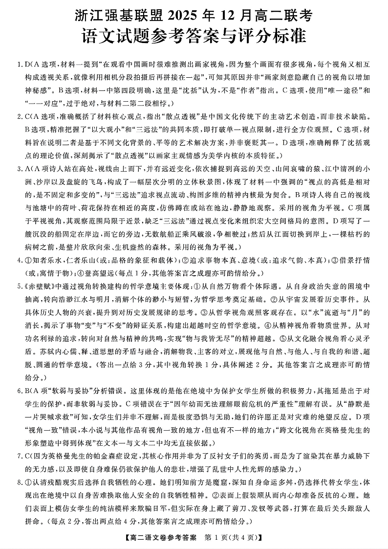 高二语文答案--浙江省强基联盟2025-2026学年高二上学期12月联考