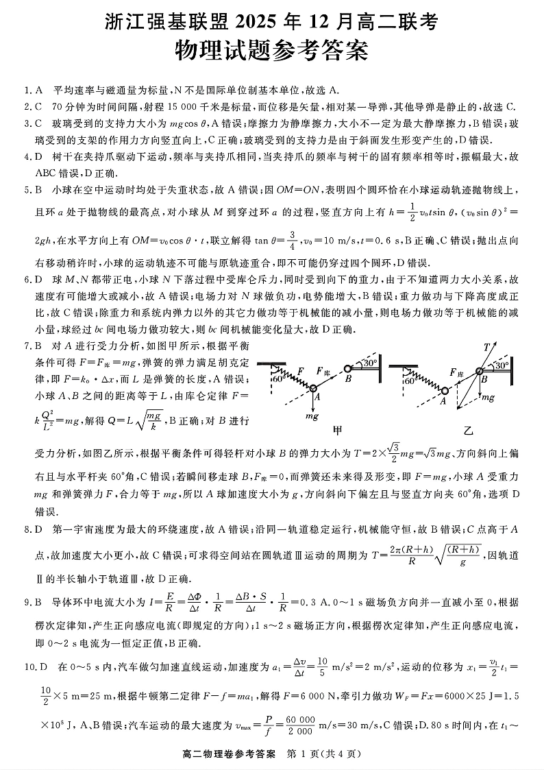 高二物理答案--浙江省强基联盟2025-2026学年高二上学期12月联考