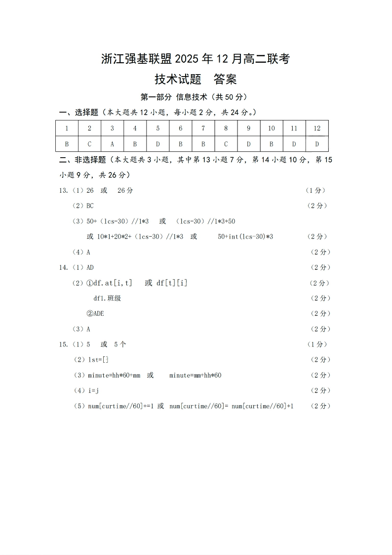 高二技术答案--浙江省强基联盟2025-2026学年高二上学期12月联考