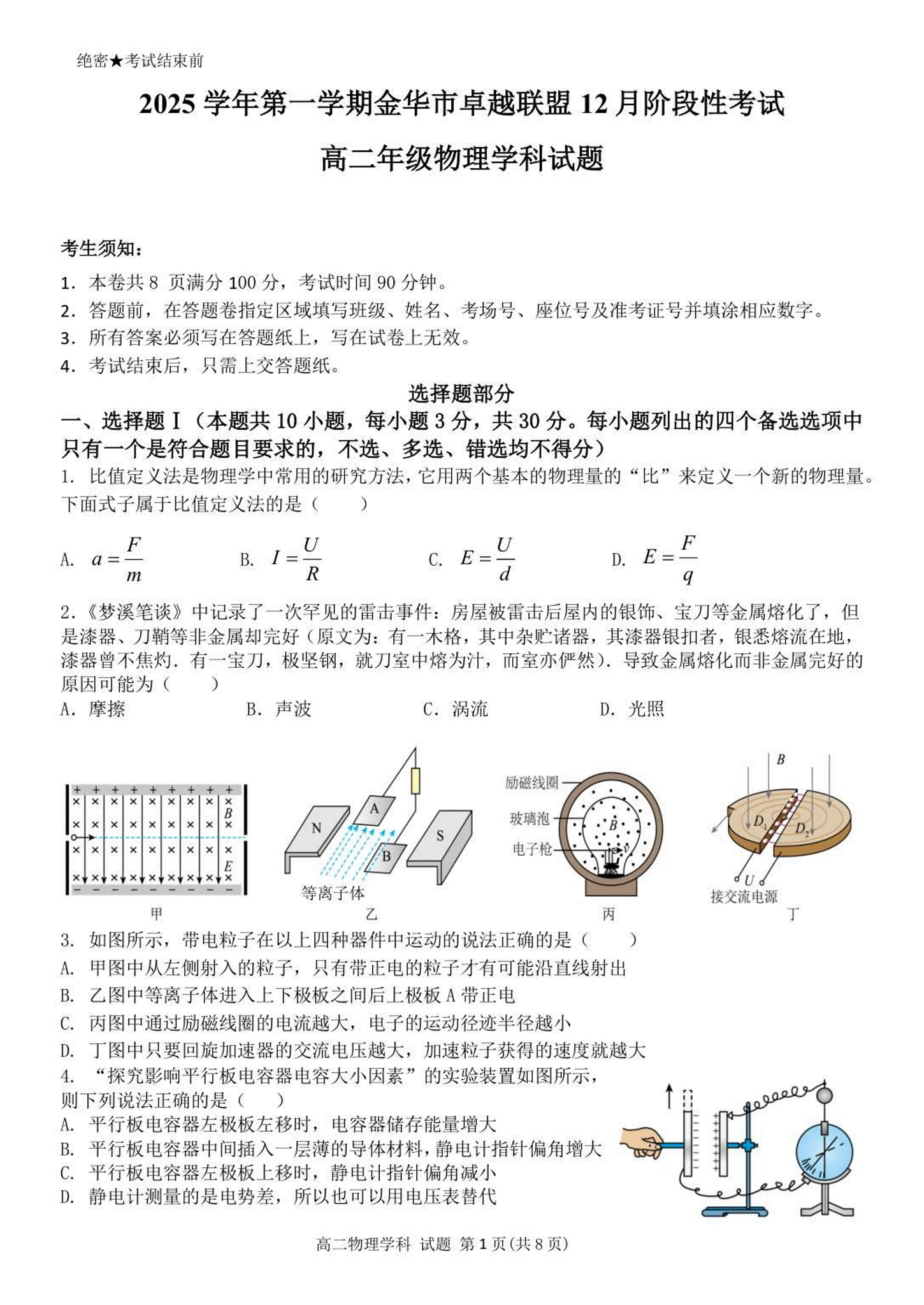 高二物理--浙江省金华市卓越联盟2025-2026学年高二上学期12月月考