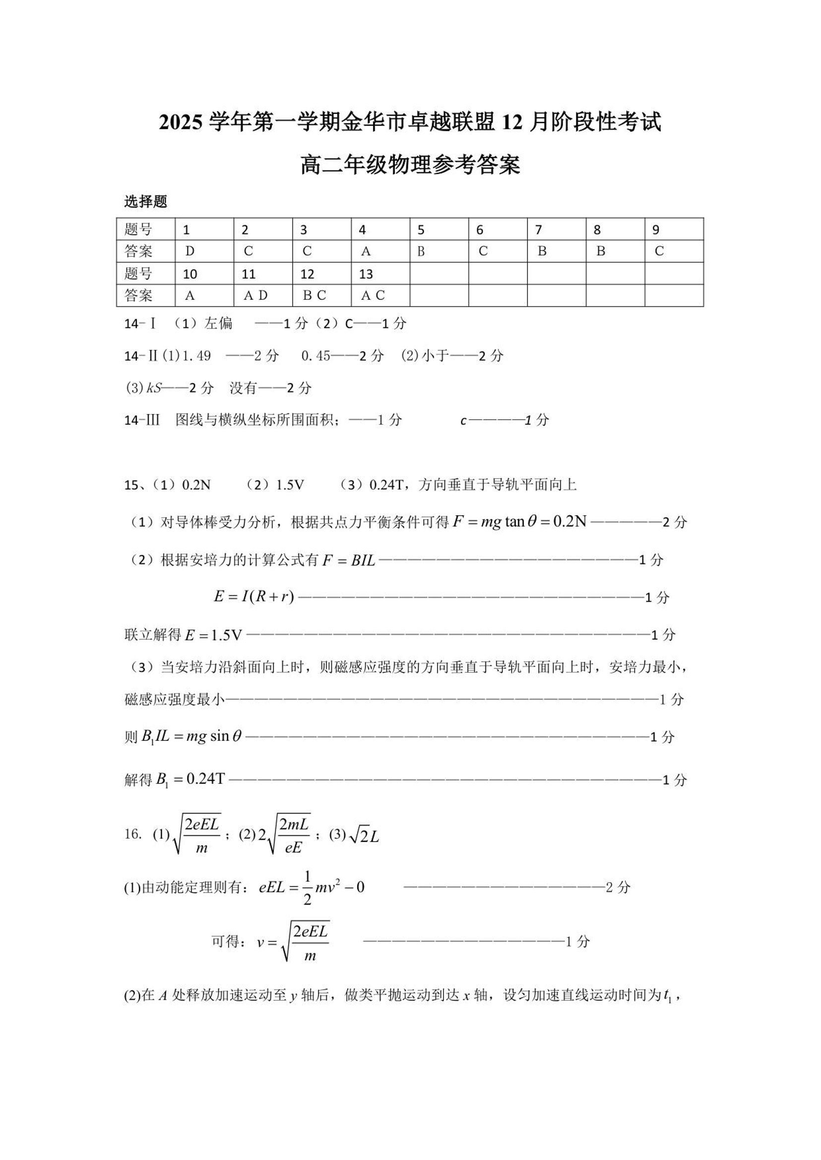 高二物理答案--浙江省金华市卓越联盟2025-2026学年高二上学期12月月考