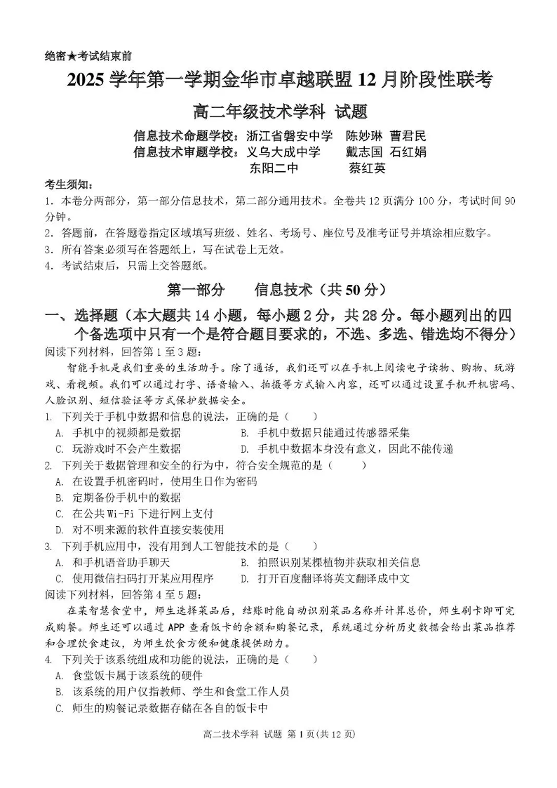 高二技术+答案--浙江省金华市卓越联盟2025-2026学年高二上学期12月月考