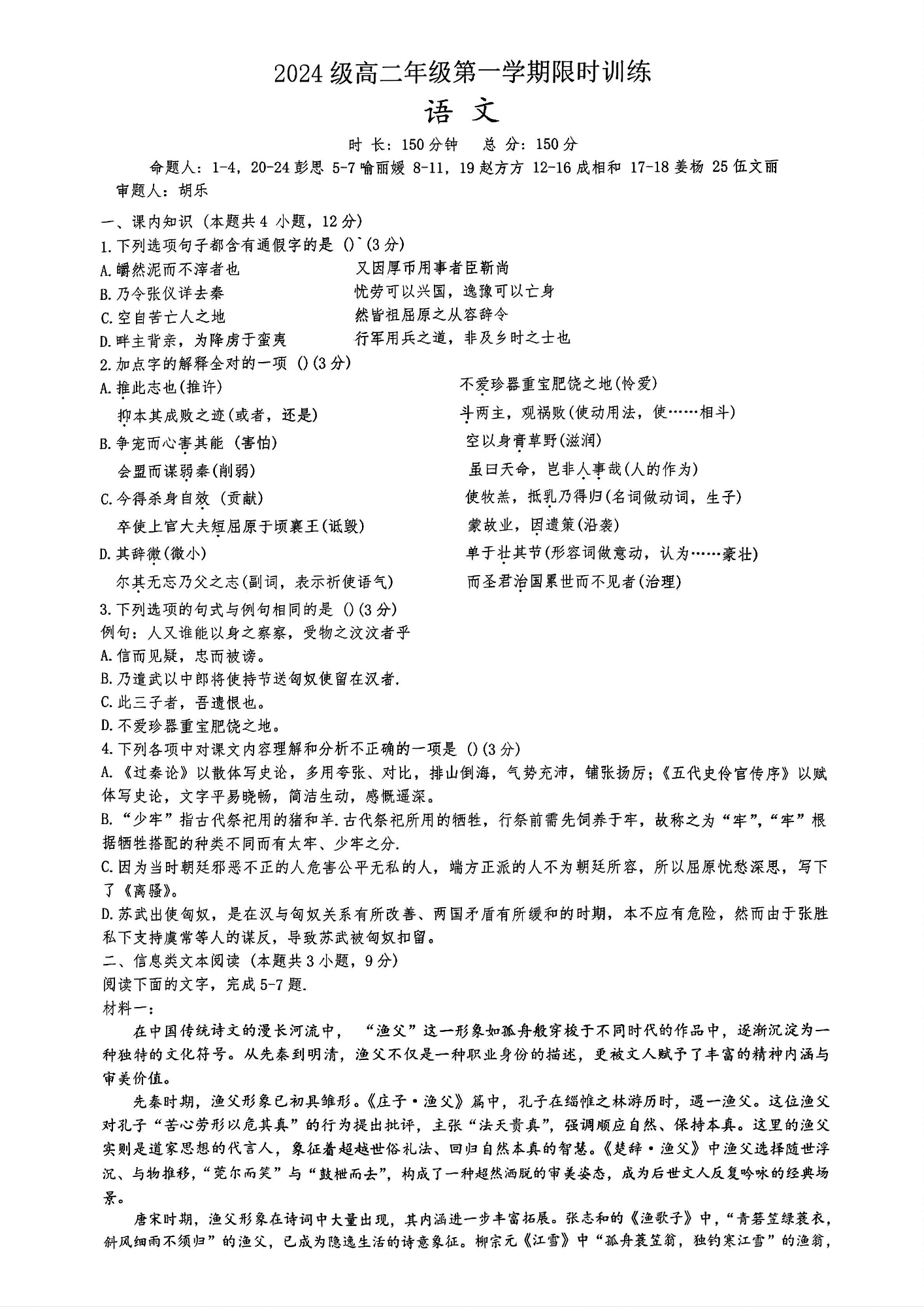 高二语文--湖南省长沙市南雅、雅礼实验中学等五校联考2025-2026学年高二上学期12月限时训练