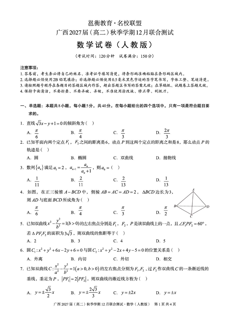 高二数学(人教版)--广西邕衡教育·名校联盟2025-2026学年高二秋季学期12月联合测试