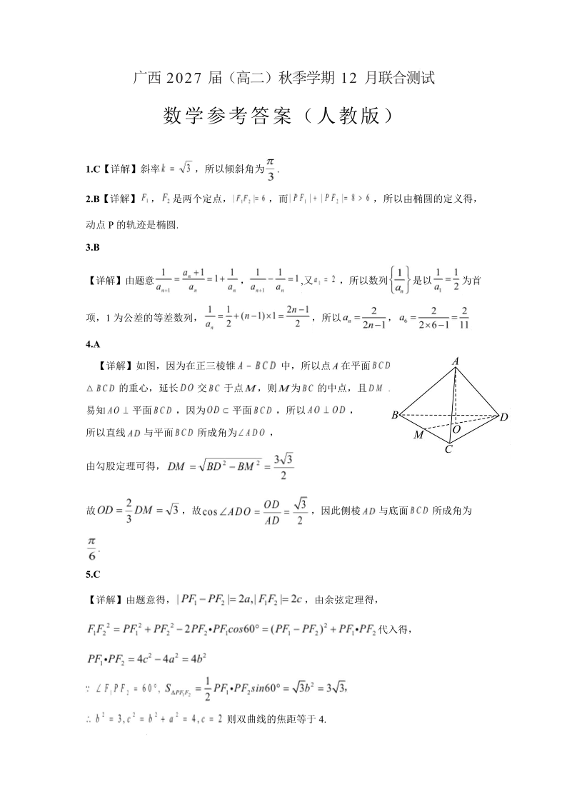 高二数学答案(人教版)--广西邕衡教育·名校联盟2025-2026学年高二秋季学期12月联合测试