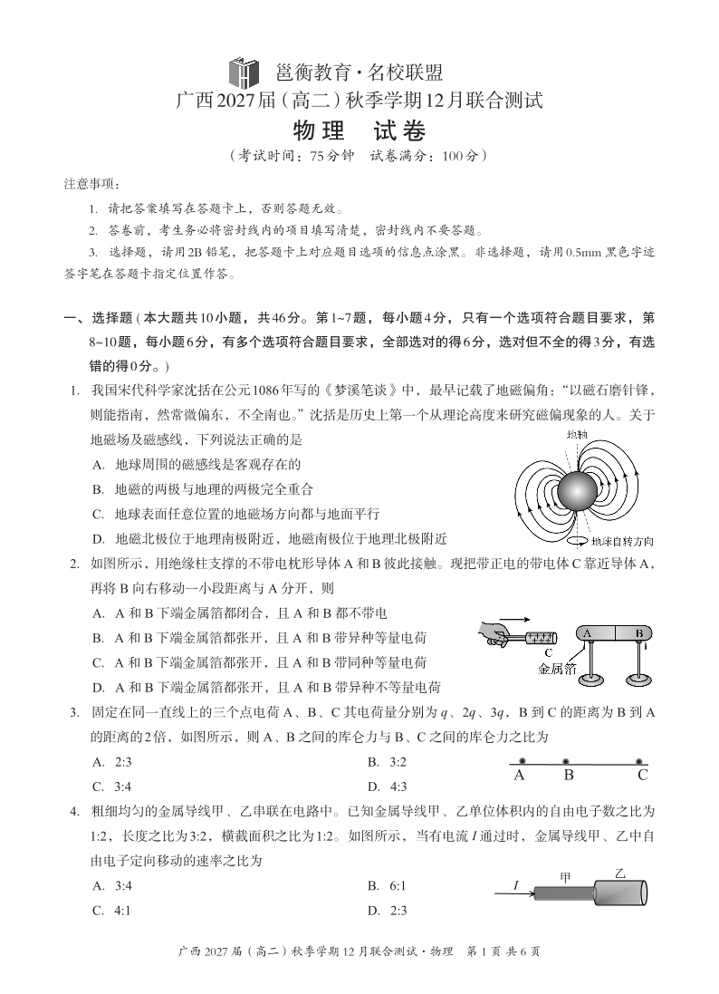 高二物理--广西邕衡教育·名校联盟2025-2026学年高二秋季学期12月联合测试