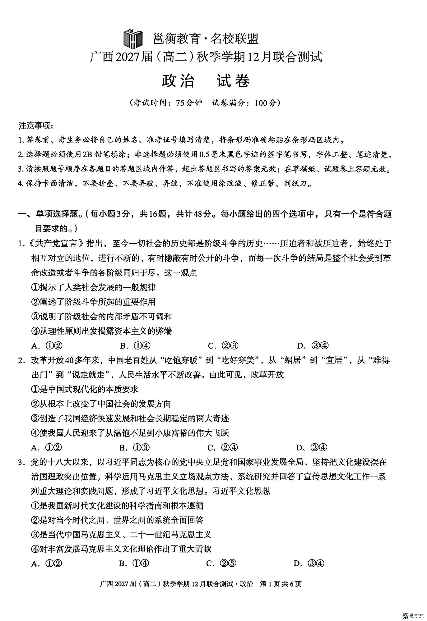 高二政治--广西邕衡教育·名校联盟2025-2026学年高二秋季学期12月联合测试