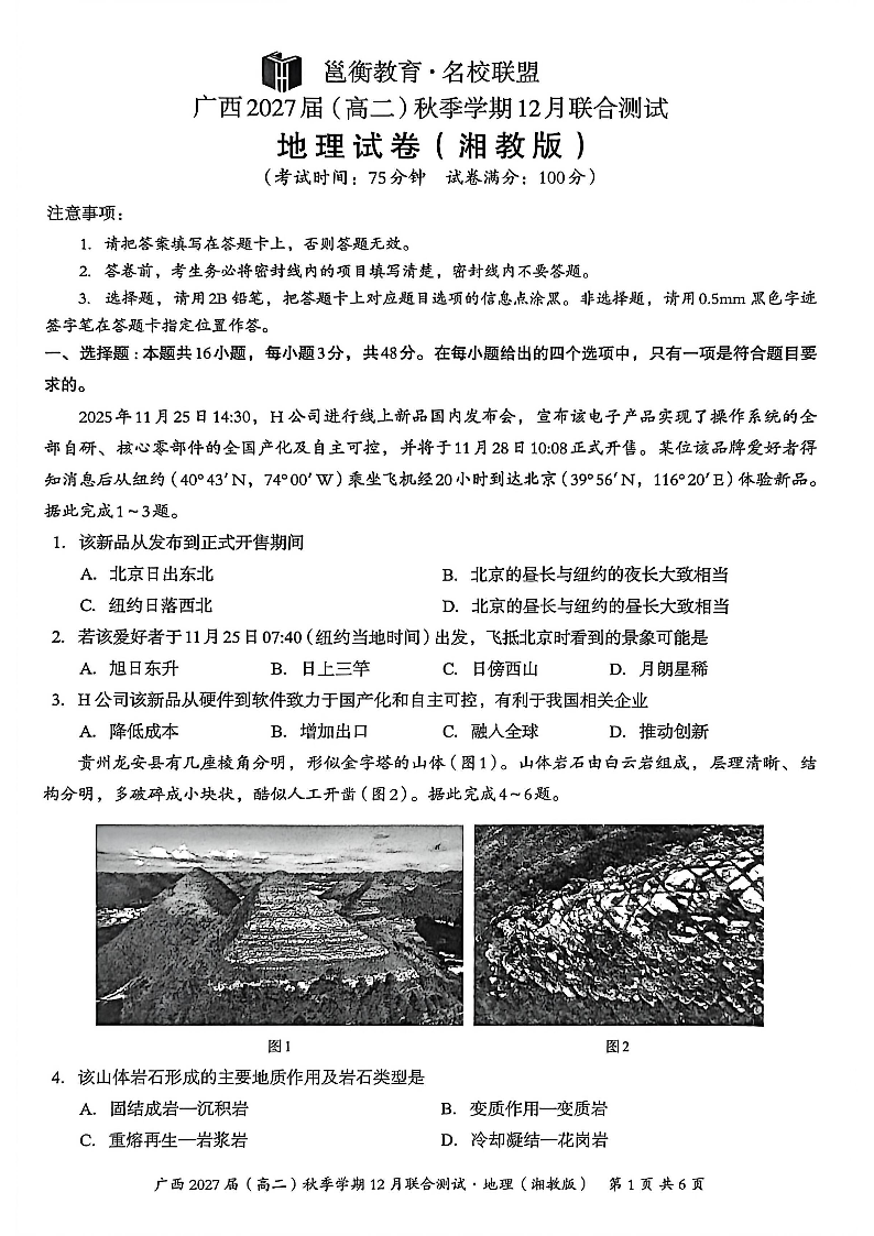 高二地理(湘教版)--广西邕衡教育·名校联盟2025-2026学年高二秋季学期12月联合测试