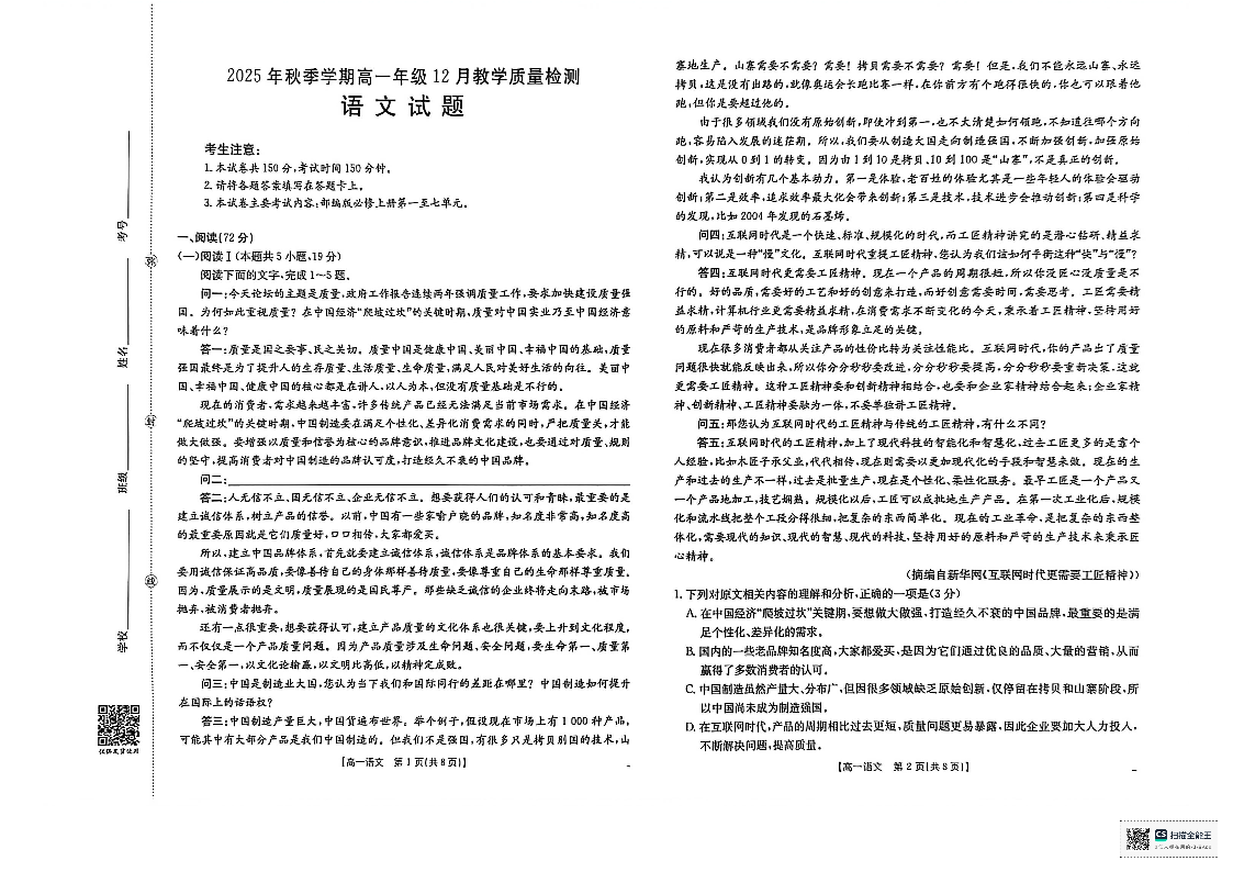 高一语文--广西壮族自治区贵港市、桂林市2025-2026学年高一上学期12月月考