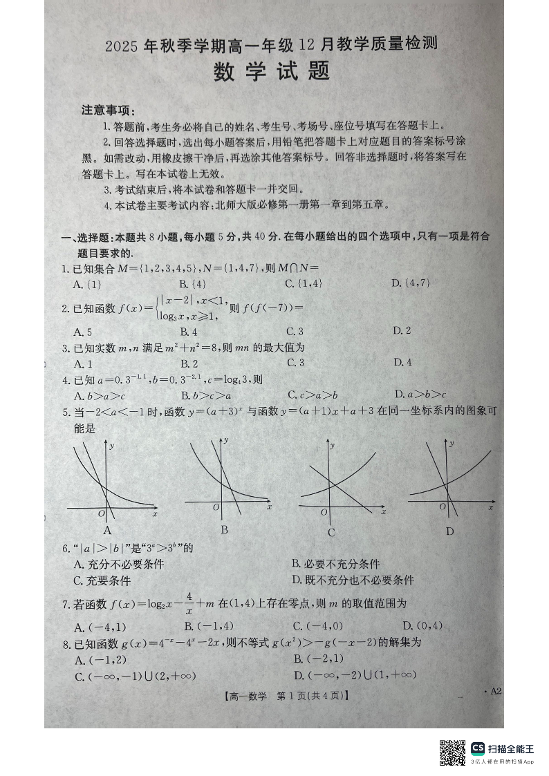 高一数学--广西壮族自治区贵港市、桂林市2025-2026学年高一上学期12月月考