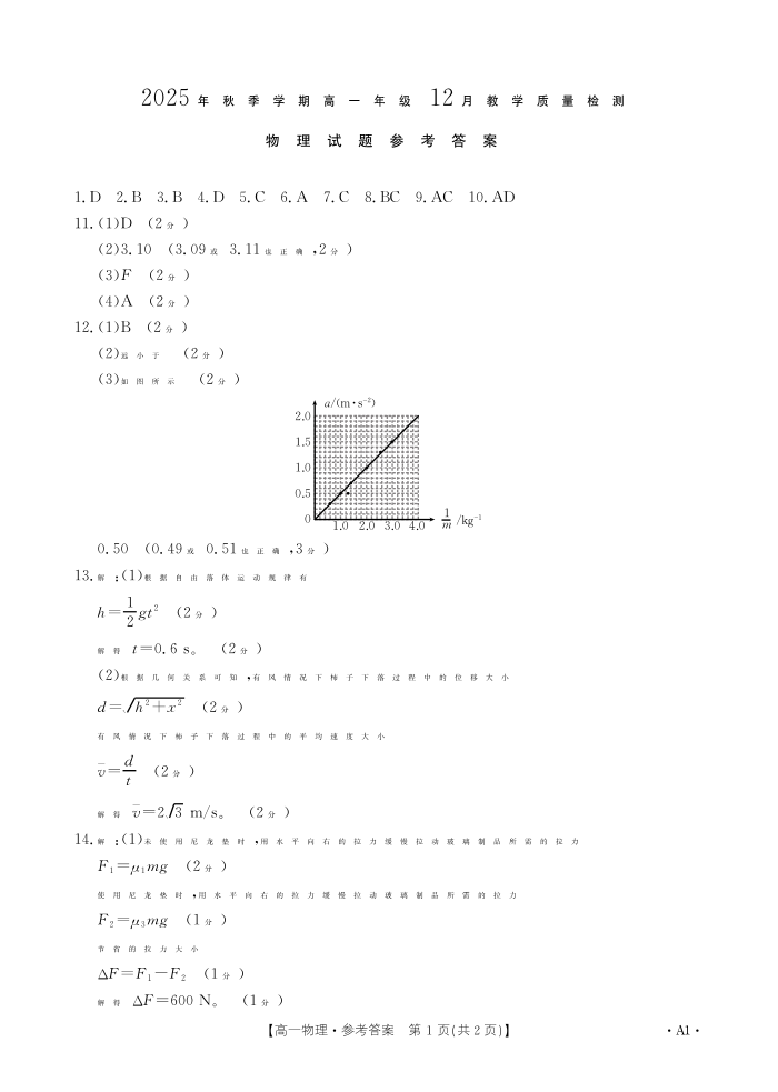 高一物理答案--广西壮族自治区贵港市、桂林市2025-2026学年高一上学期12月月考