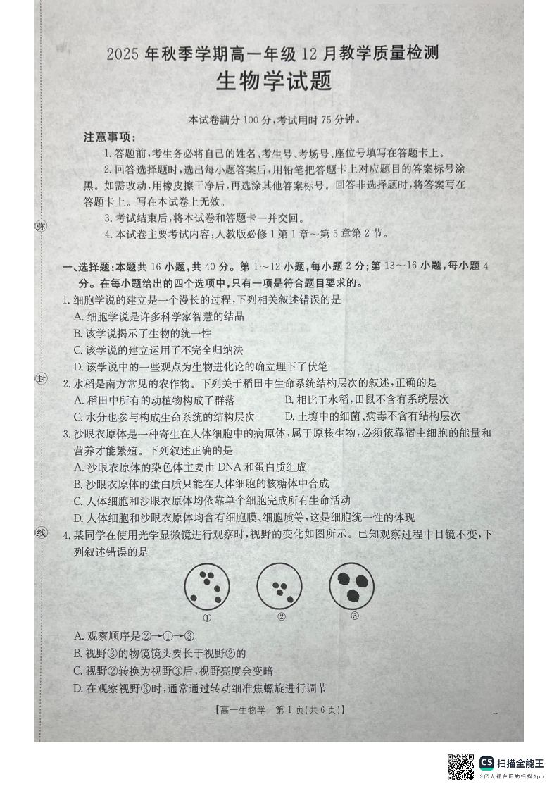 高一生物--广西壮族自治区贵港市、桂林市2025-2026学年高一上学期12月月考