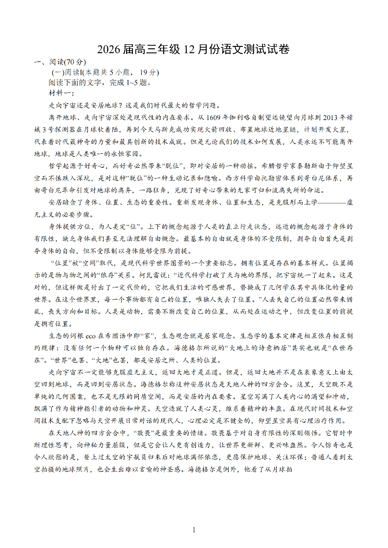 高三语文+答案--江苏省南京师大附中、海安中学、天一中学、海门中学G4联考2026届高三上学期12月月考