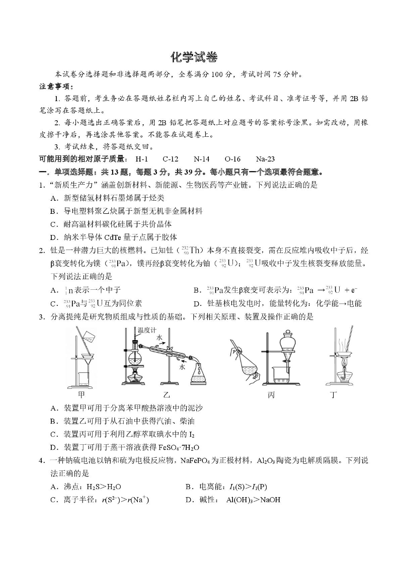 高三化学--江苏省南京师大附中、海安中学、天一中学、海门中学G4联考2026届高三上学期12月月考