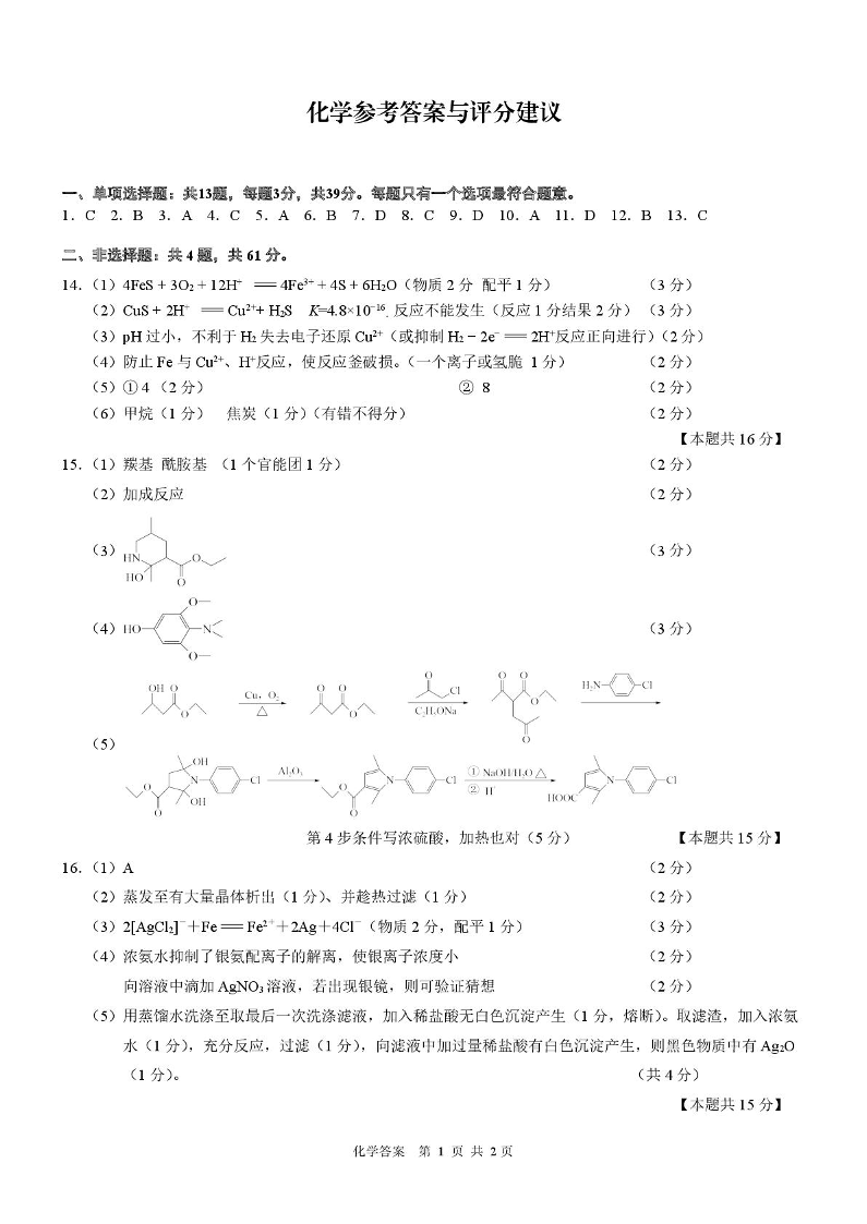 高三化学答案--江苏省南京师大附中、海安中学、天一中学、海门中学G4联考2026届高三上学期12月月考