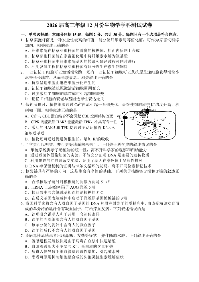 高三生物--江苏省南京师大附中、海安中学、天一中学、海门中学G4联考2026届高三上学期12月月考