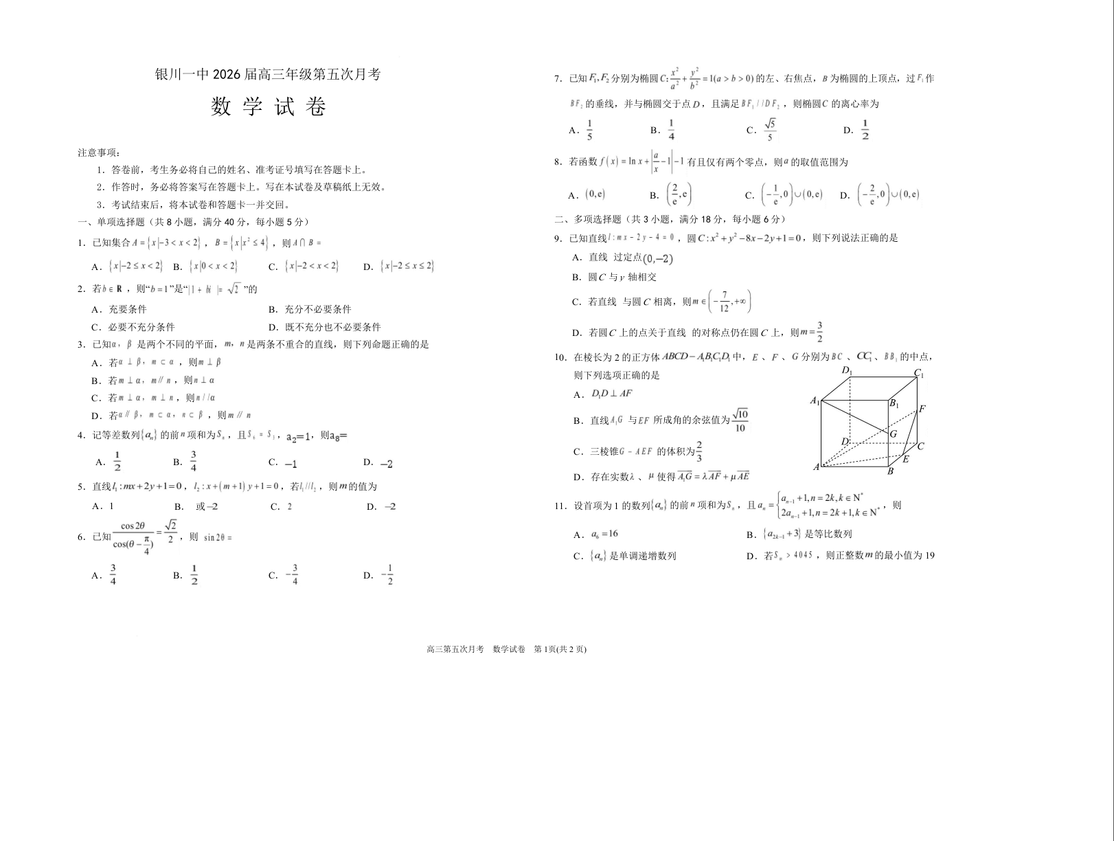 高三数学---宁夏银川一中2026届高三上学期第五次月考(12月)
