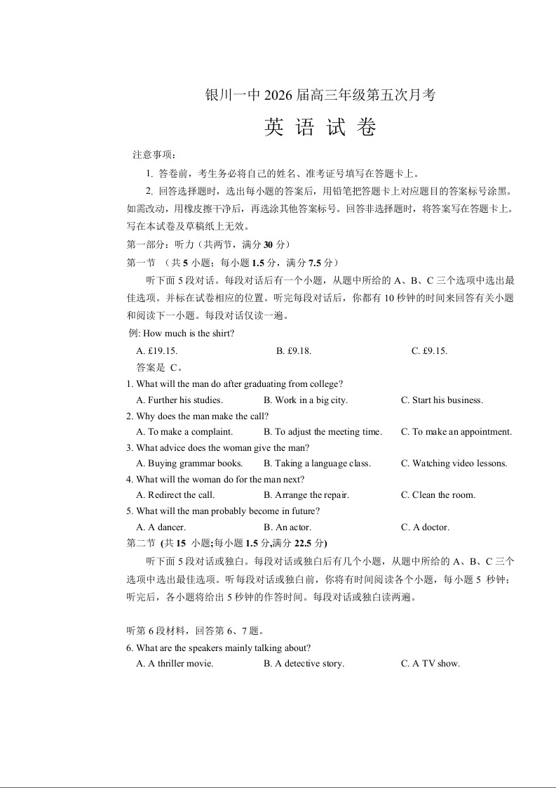 高三英语---宁夏银川一中2026届高三上学期第五次月考(12月)