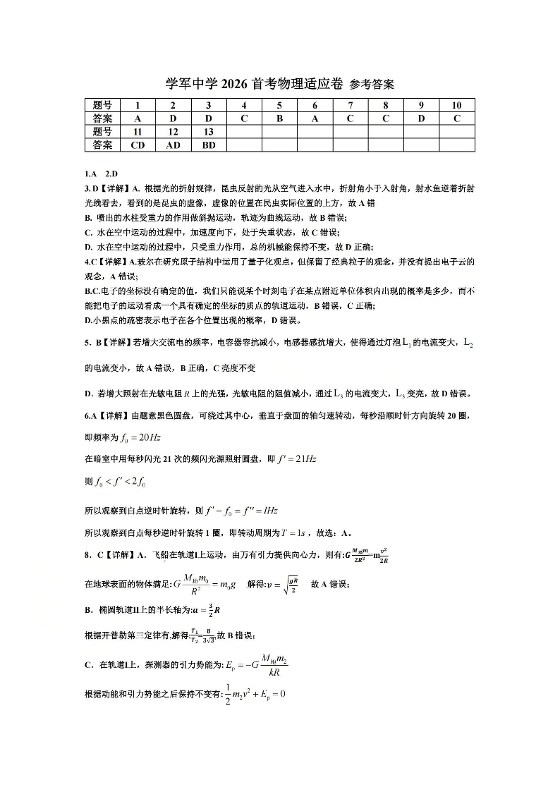 高三物理答案--浙江省杭州学军中学2026届高三上学期首考适应性考试
