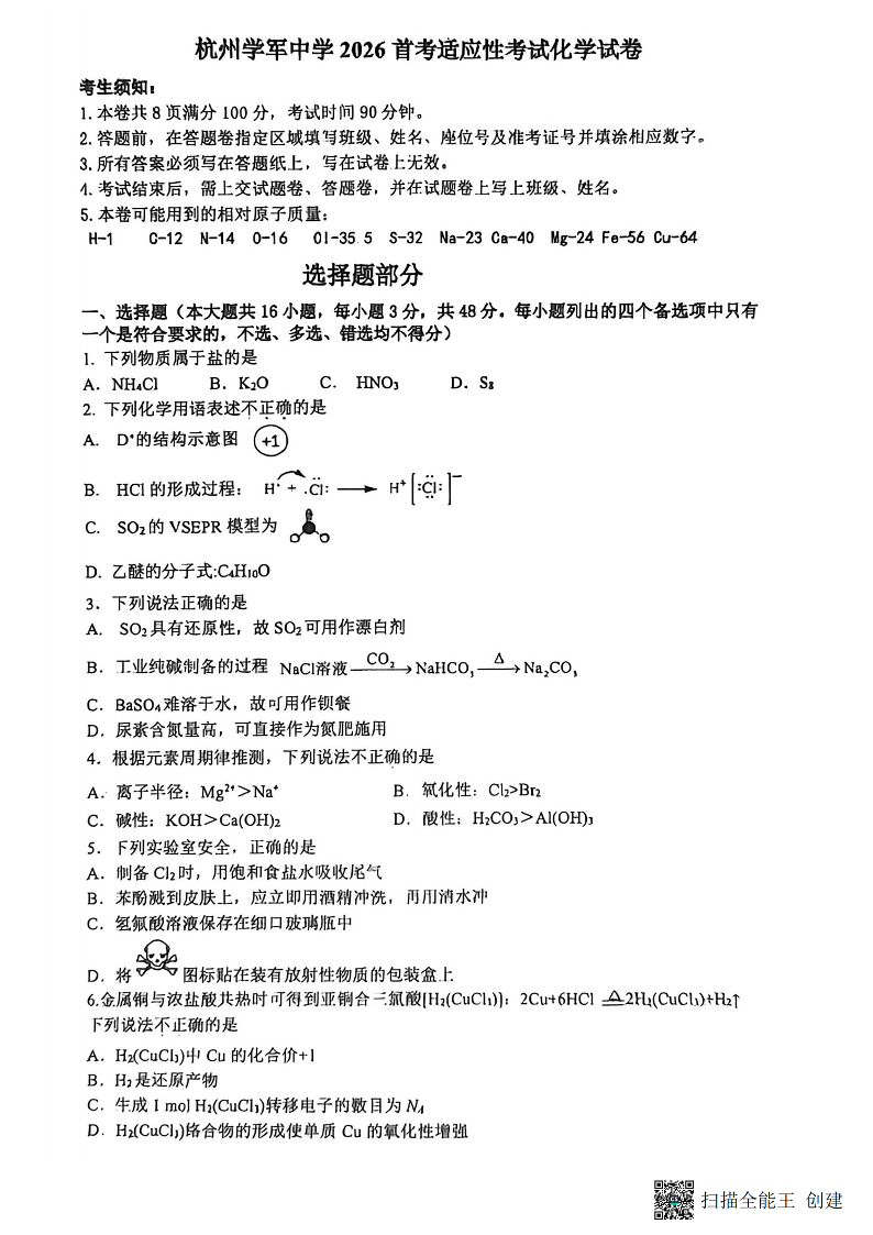高三化学--浙江省杭州学军中学2026届高三上学期首考适应性考试