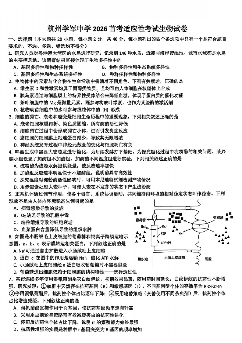 高三生物--浙江省杭州学军中学2026届高三上学期首考适应性考试