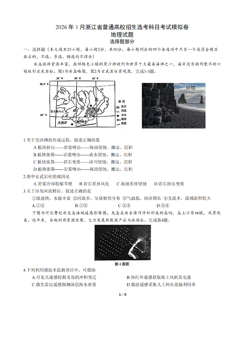 高三地理--浙江省杭州学军中学2026届高三上学期首考适应性考试