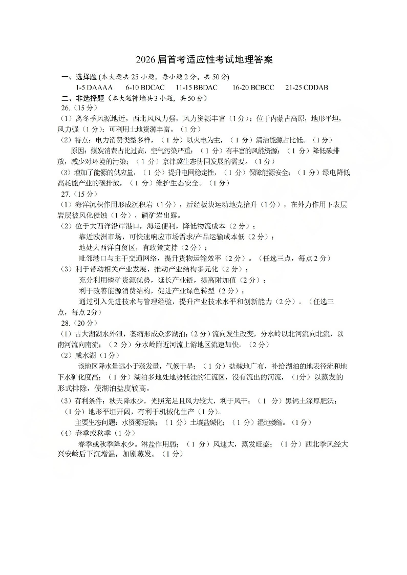 高三地理答案--浙江省杭州学军中学2026届高三上学期首考适应性考试