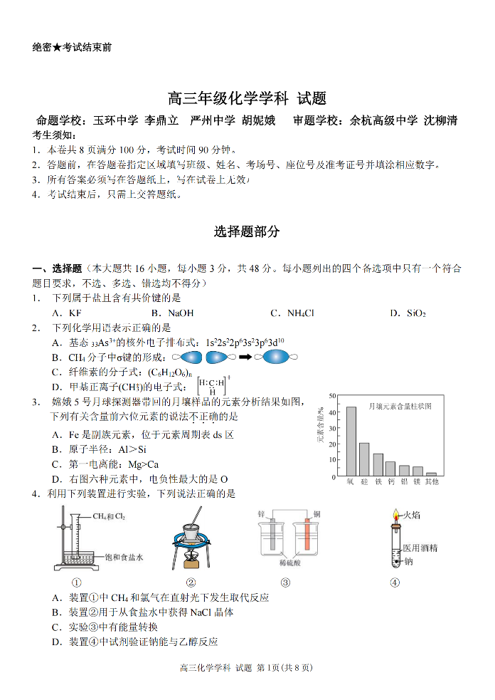 高三化学--浙江省北斗星盟2026届高三12月联考