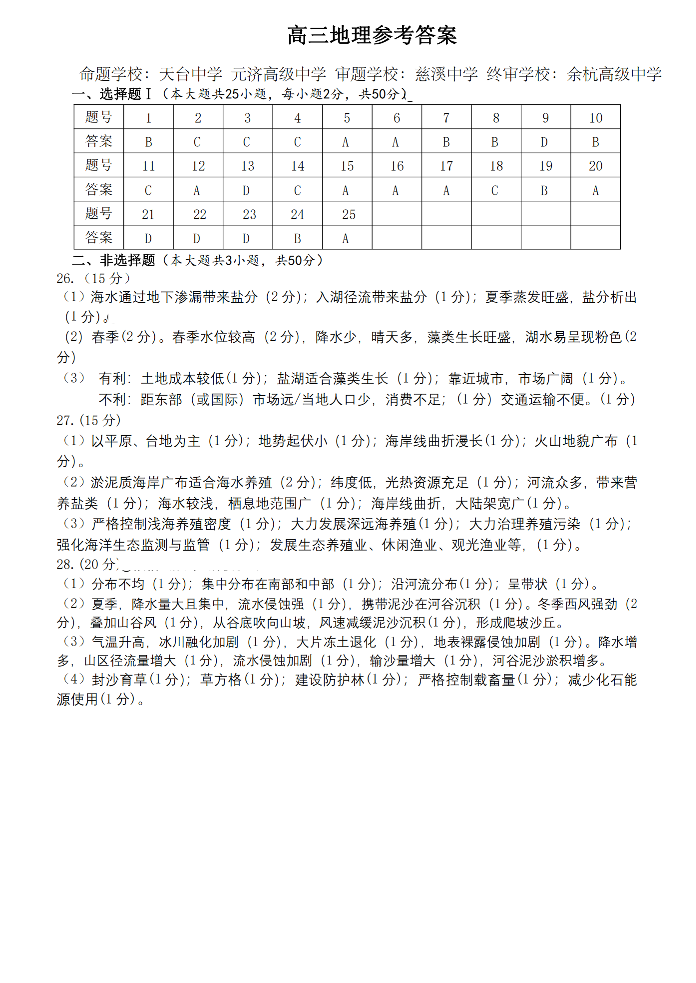 高三地理答案--浙江省北斗星盟2026届高三12月联考