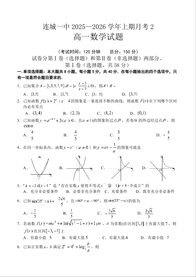 高一数学+答案--福建省连城县第一中学2025-2026学年高一上学期12月月考