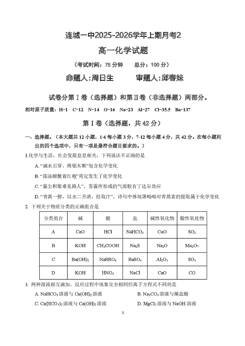 高一化学+答案--福建省连城县第一中学2025-2026学年高一上学期12月月考