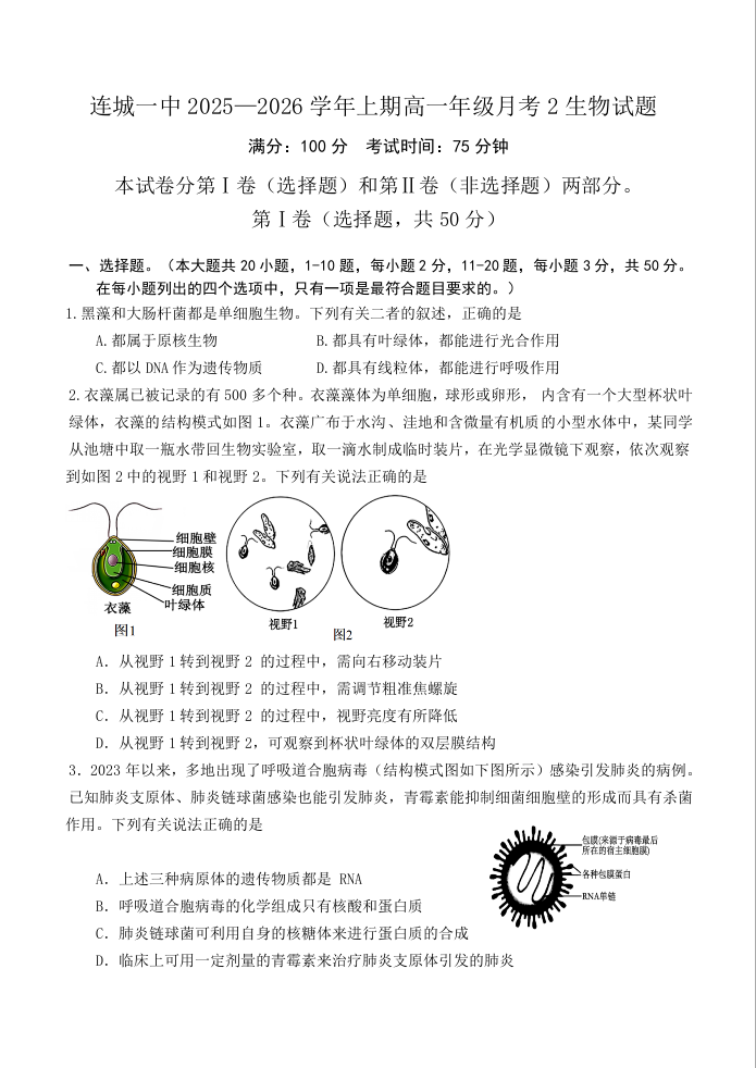 高一生物+答案--福建省连城县第一中学2025-2026学年高一上学期12月月考