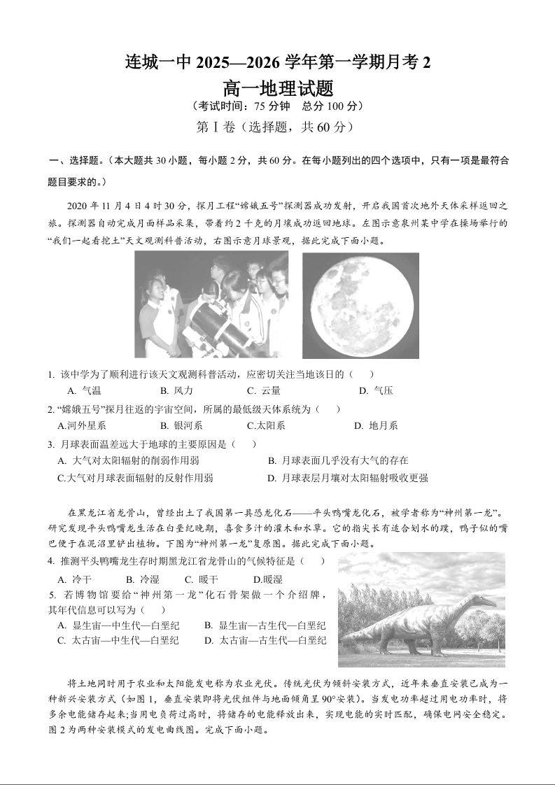 高一地理+答案--福建省连城县第一中学2025-2026学年高一上学期12月月考