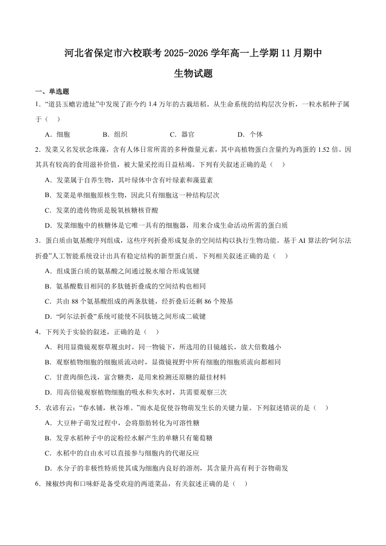高一生物+答案--河北省保定市六校联盟2025-2026学年高一上学期期中联考