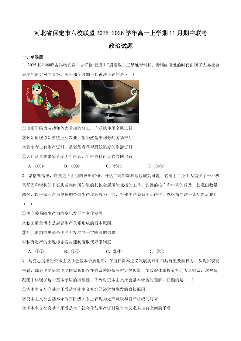 高一政治+答案--河北省保定市六校联盟2025-2026学年高一上学期期中联考