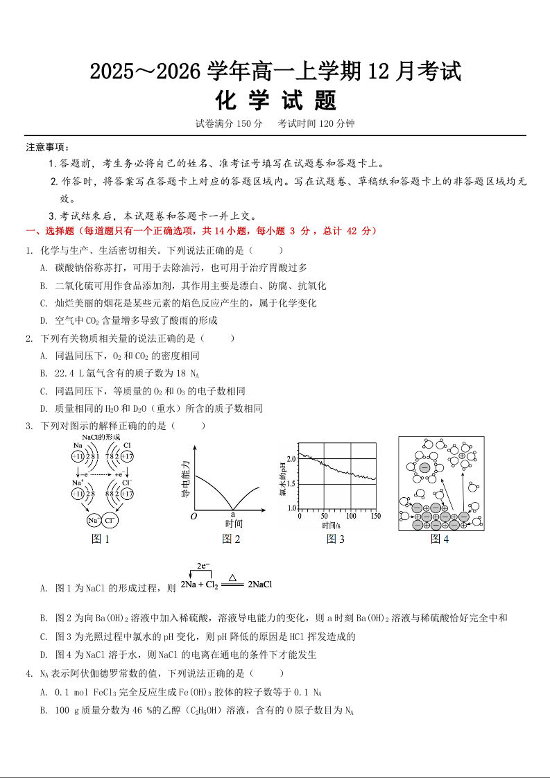 高一化学--河北省保定市唐县第一中学2025-2026学年高一上学期12月月考
