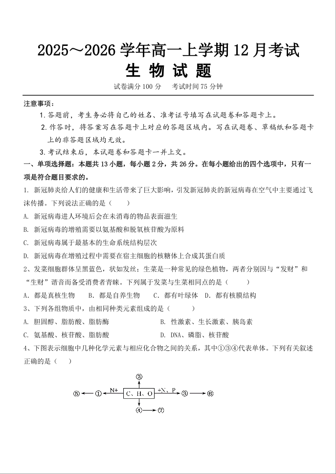 高一生物--河北省保定市唐县第一中学2025-2026学年高一上学期12月月考