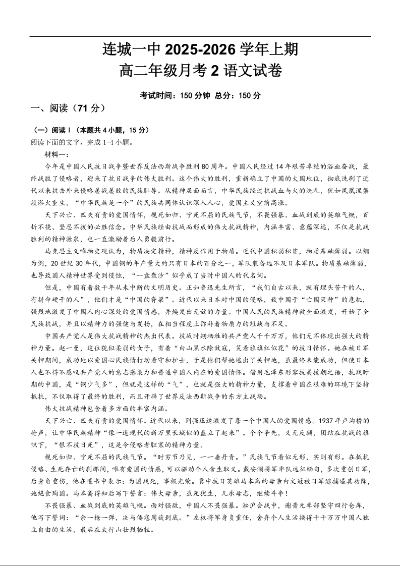 高二语文+答案--福建省连城县第一中学2025-2026学年高二上学期12月月考