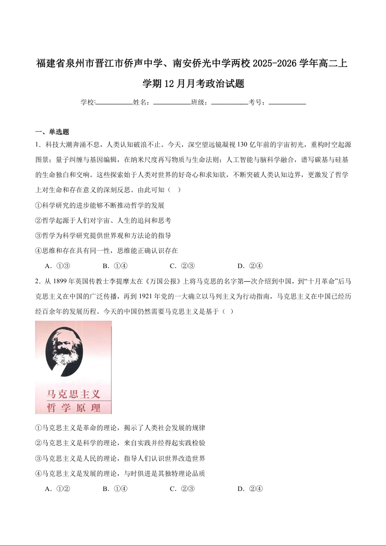高二政治+答案--福建省泉州市晋江侨声中学、南安侨光中学两校2025-2026学年高二上学期12月联考二