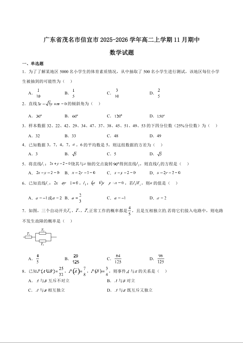 高二数学+答案--广东省茂名市信宜市2025-2026学年高二上学期期中考试