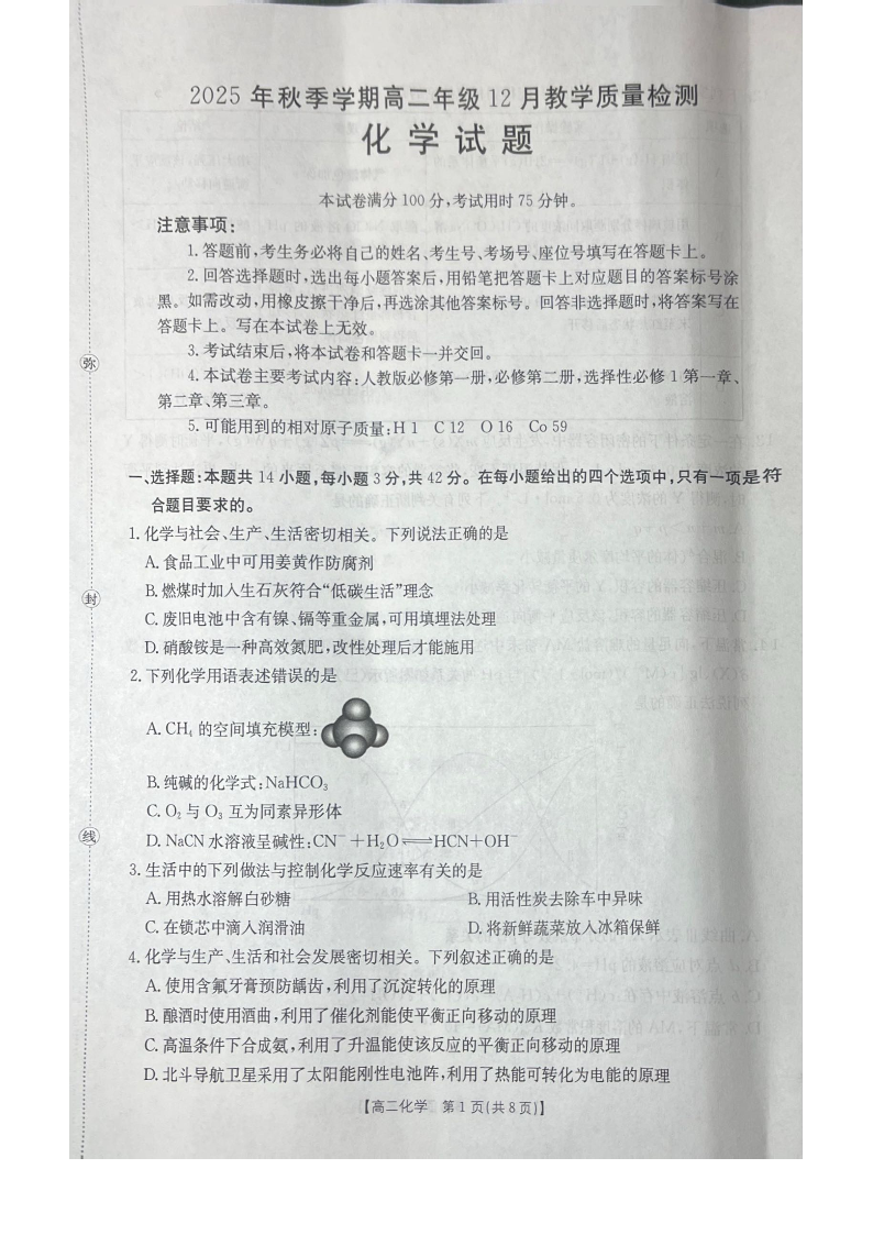 高二化学--广西壮族自治区桂林市十二县中学等2025-2026学年高二上学期12月期中