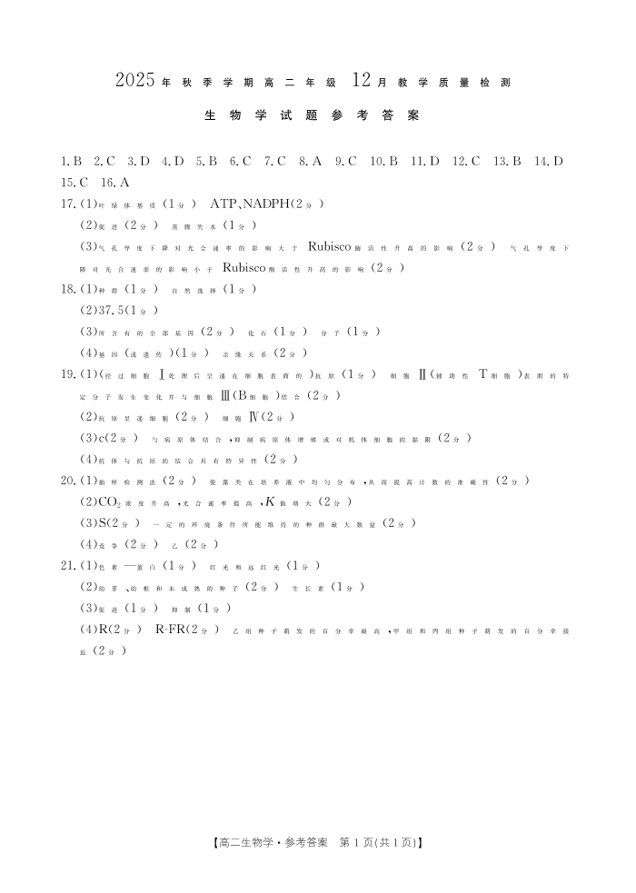 高二生物答案--广西壮族自治区桂林市十二县中学等2025-2026学年高二上学期12月期中