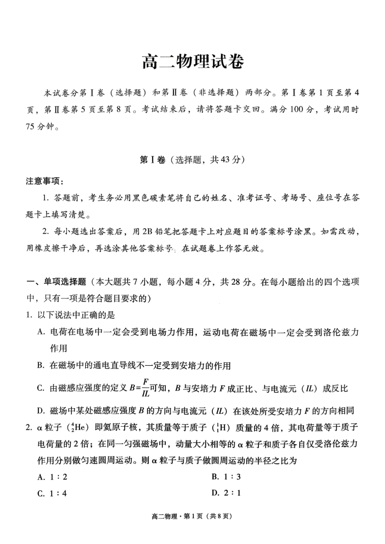高二物理--贵州省贵阳市第一中学2025-2026学年高二上学期12月月考
